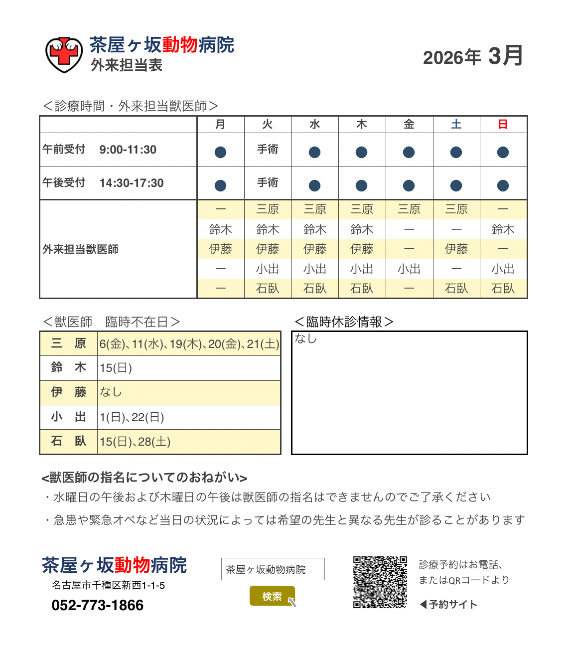 3月 獣医師 外来担当表